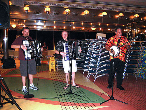 L to R: Danny Fitterer, Mike Schneider, Larry Divis. Taken during the 2008 Polka Cruise (Carnival Valor) March 2008 by Heather Schneider.