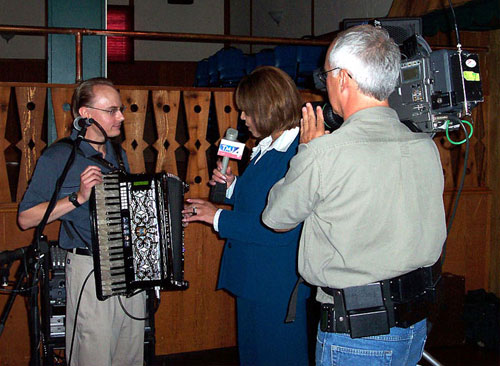 L to R: Mike Schneider, Carole Meekins, videographer from Today's TMJ4. Taken at the Pulaski Inn (Cudahy, WI) August 2005 by Dennis Wiskerchen.