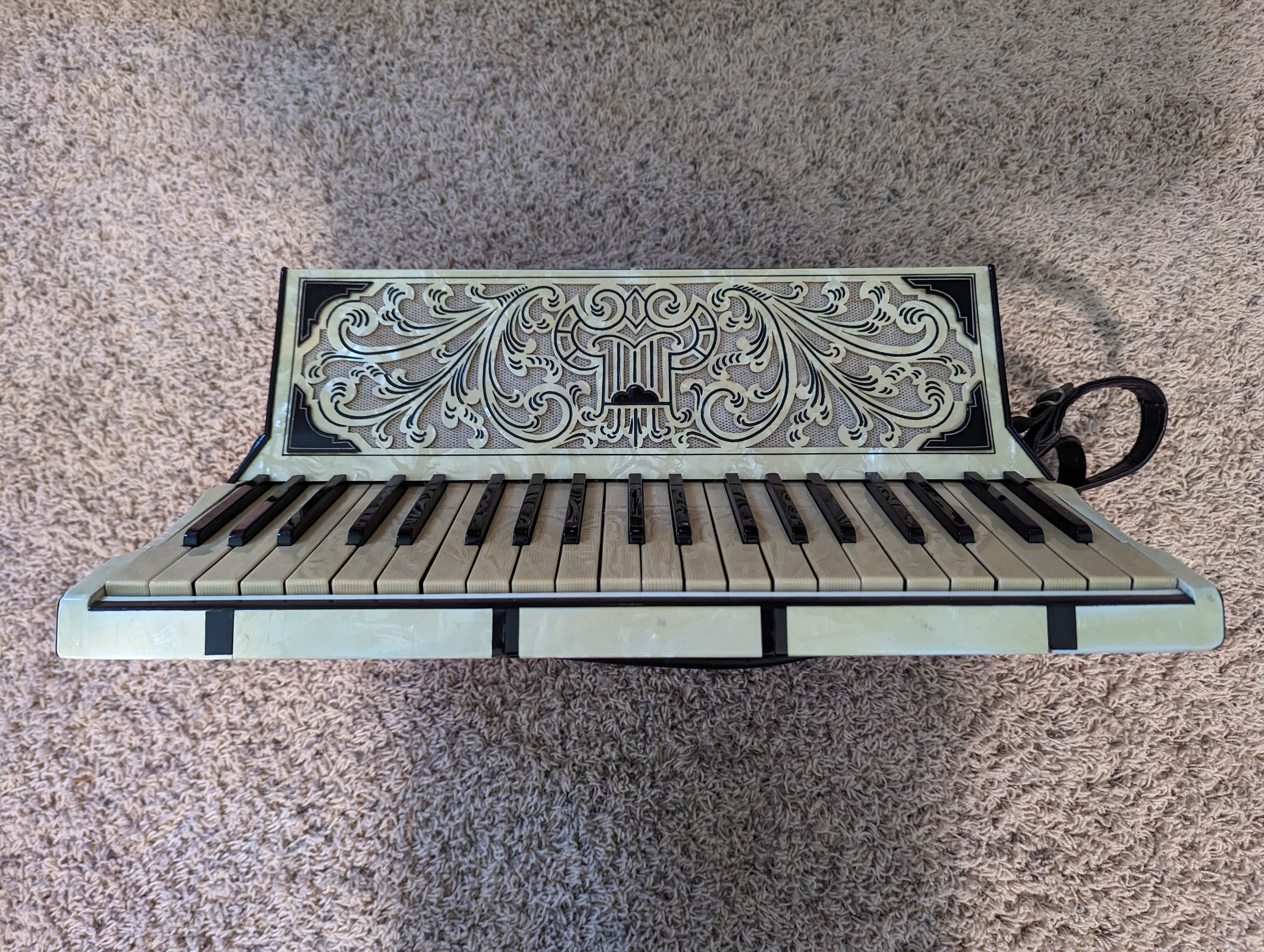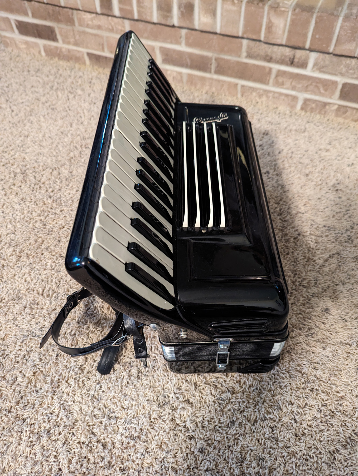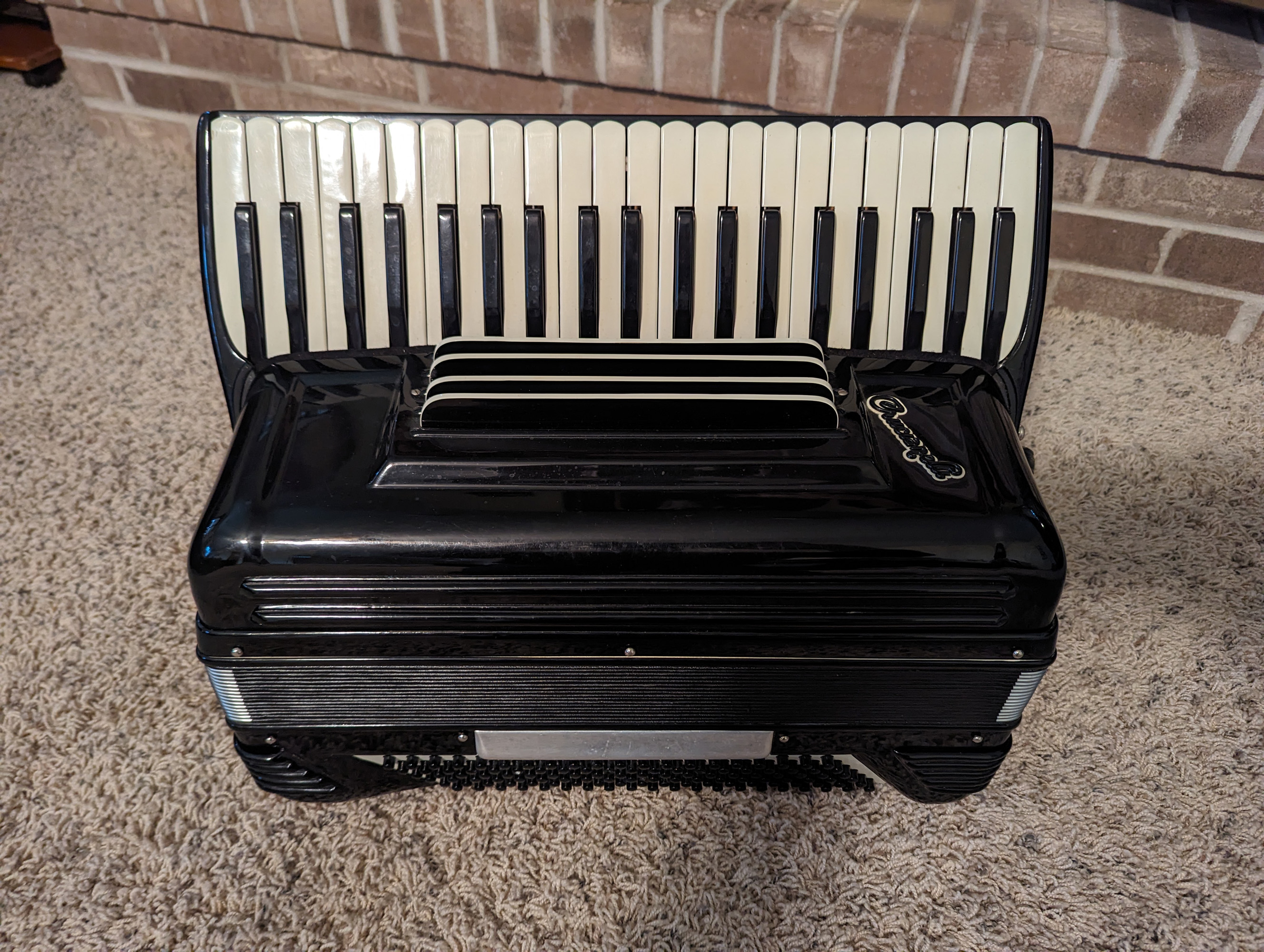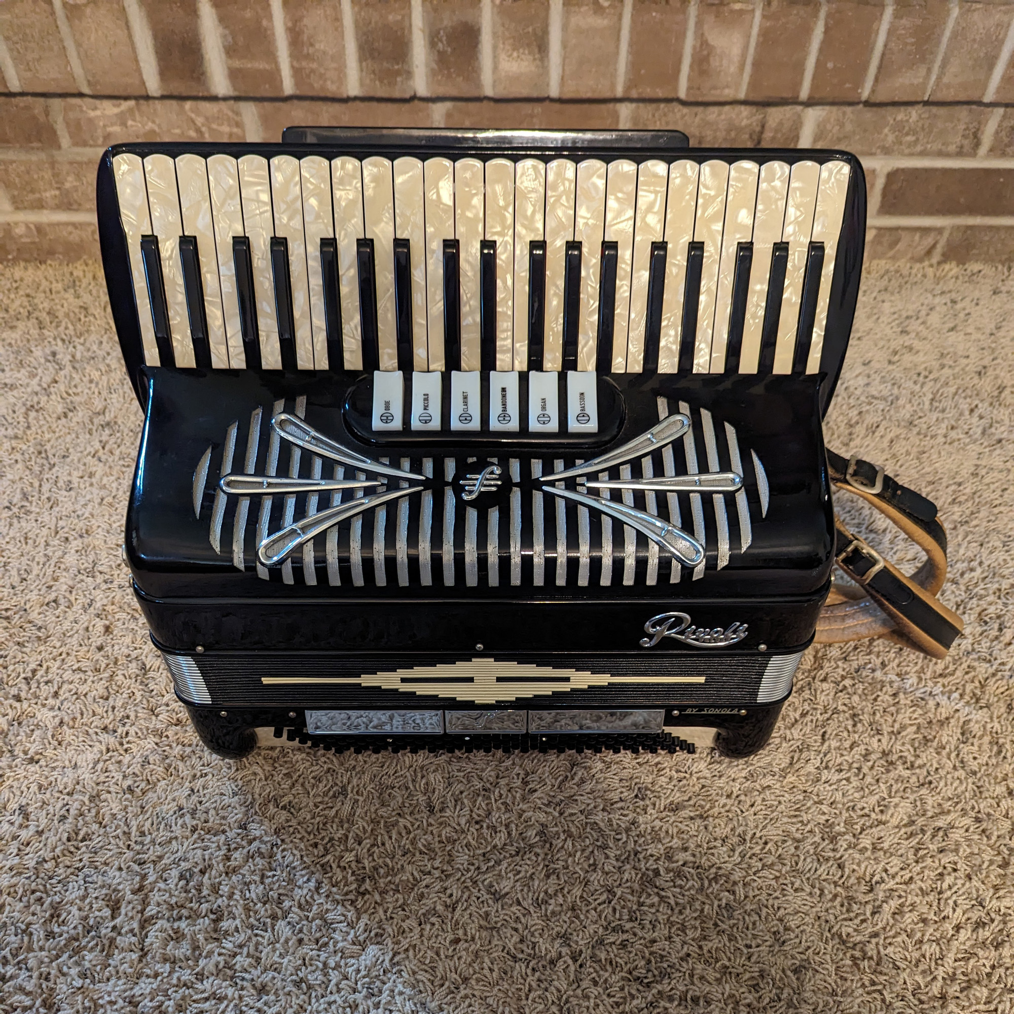 This Rivoli piano accordion is a smaller format, 41-key, 120-bass piano