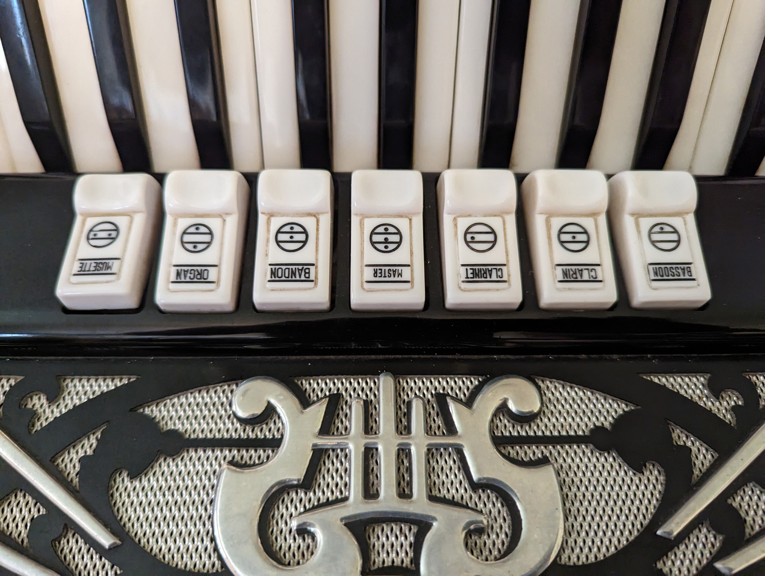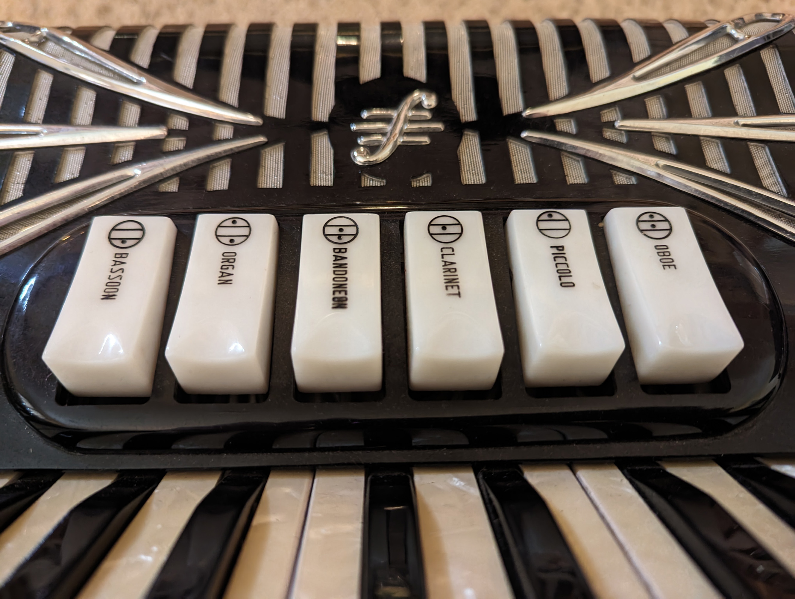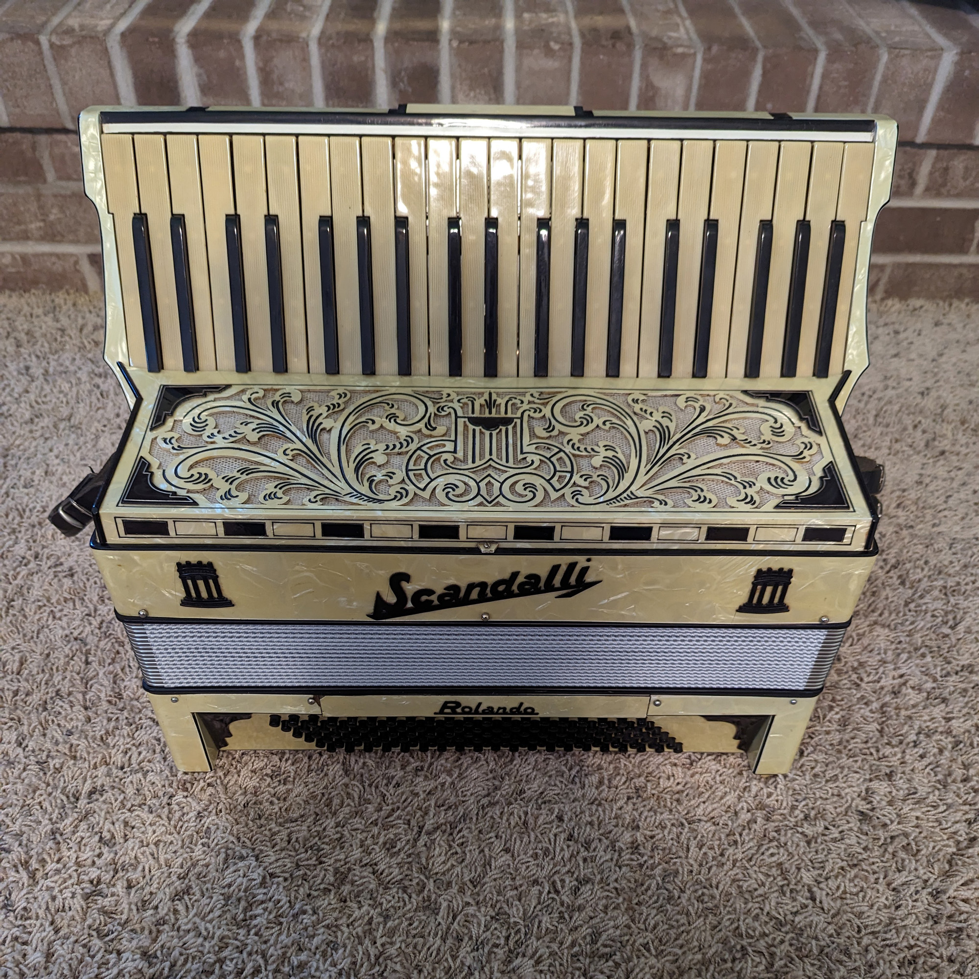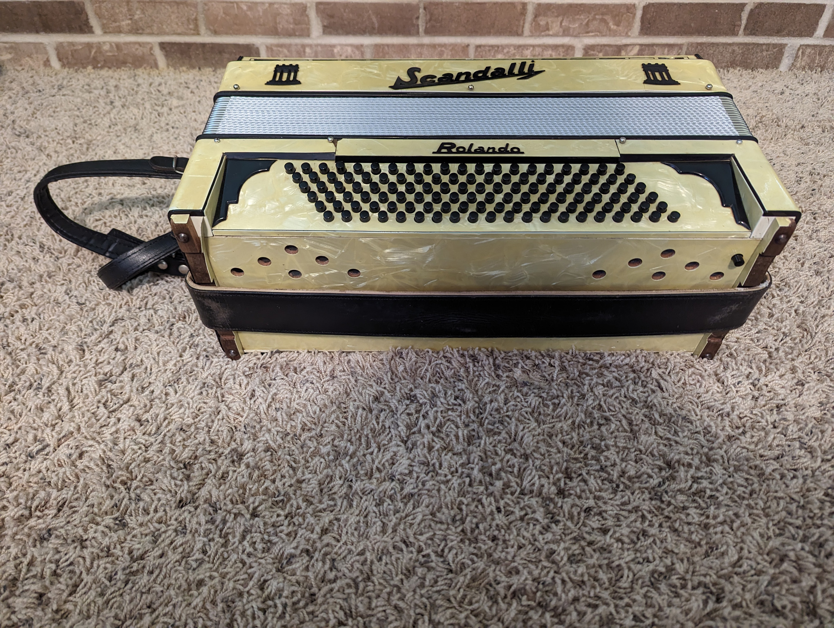 This Rivoli piano accordion is a smaller format, 41-key, 120-bass piano