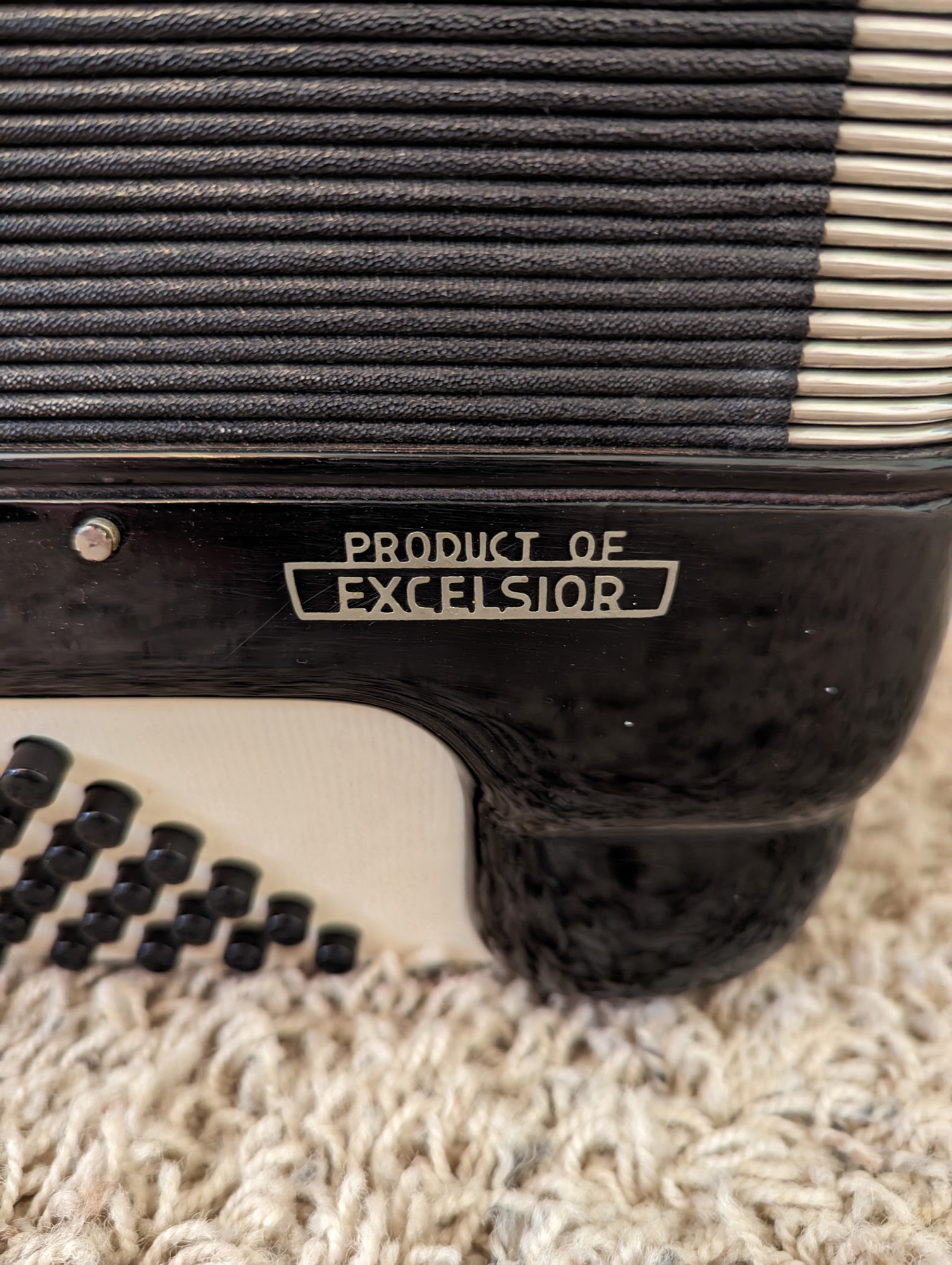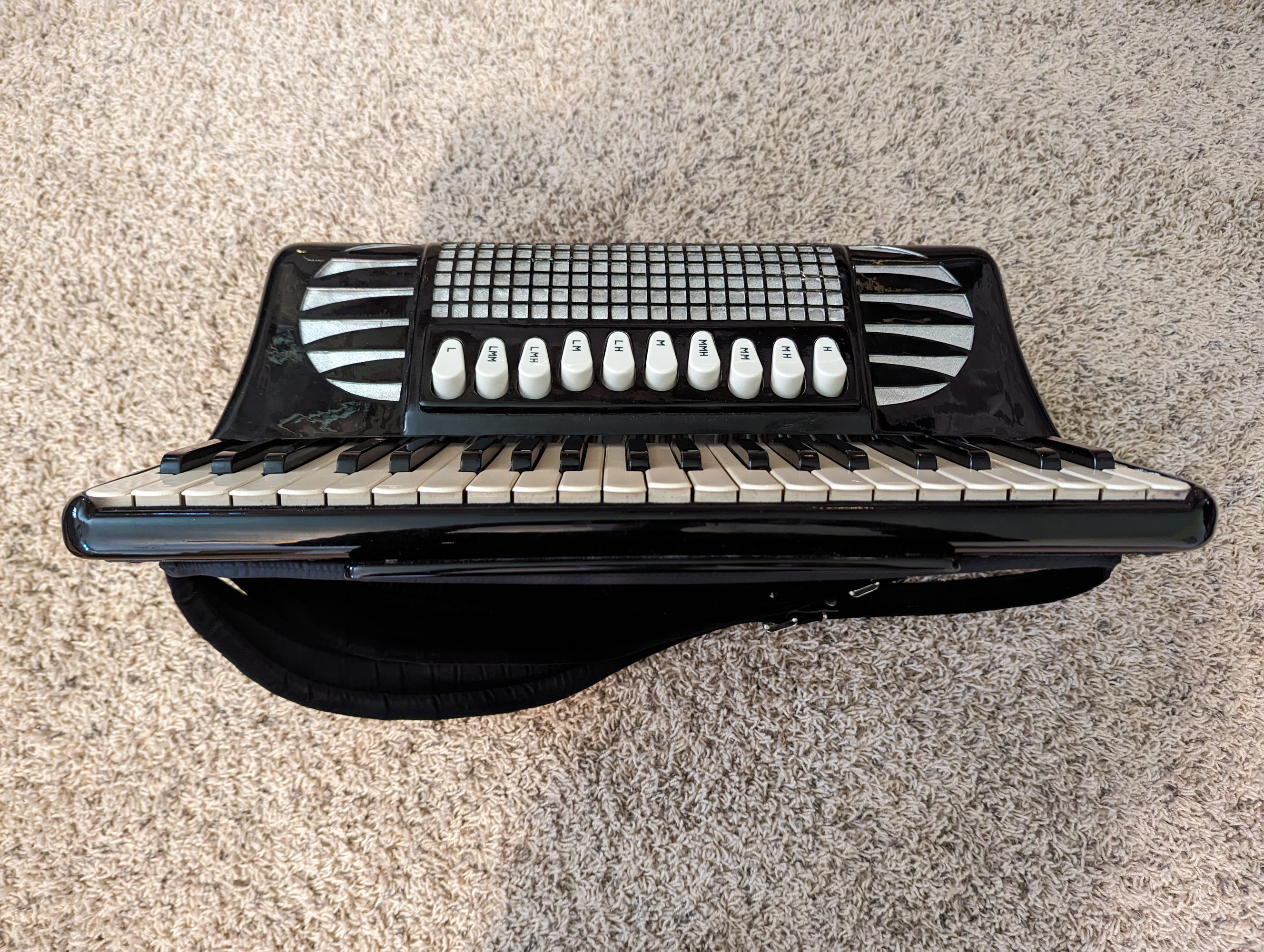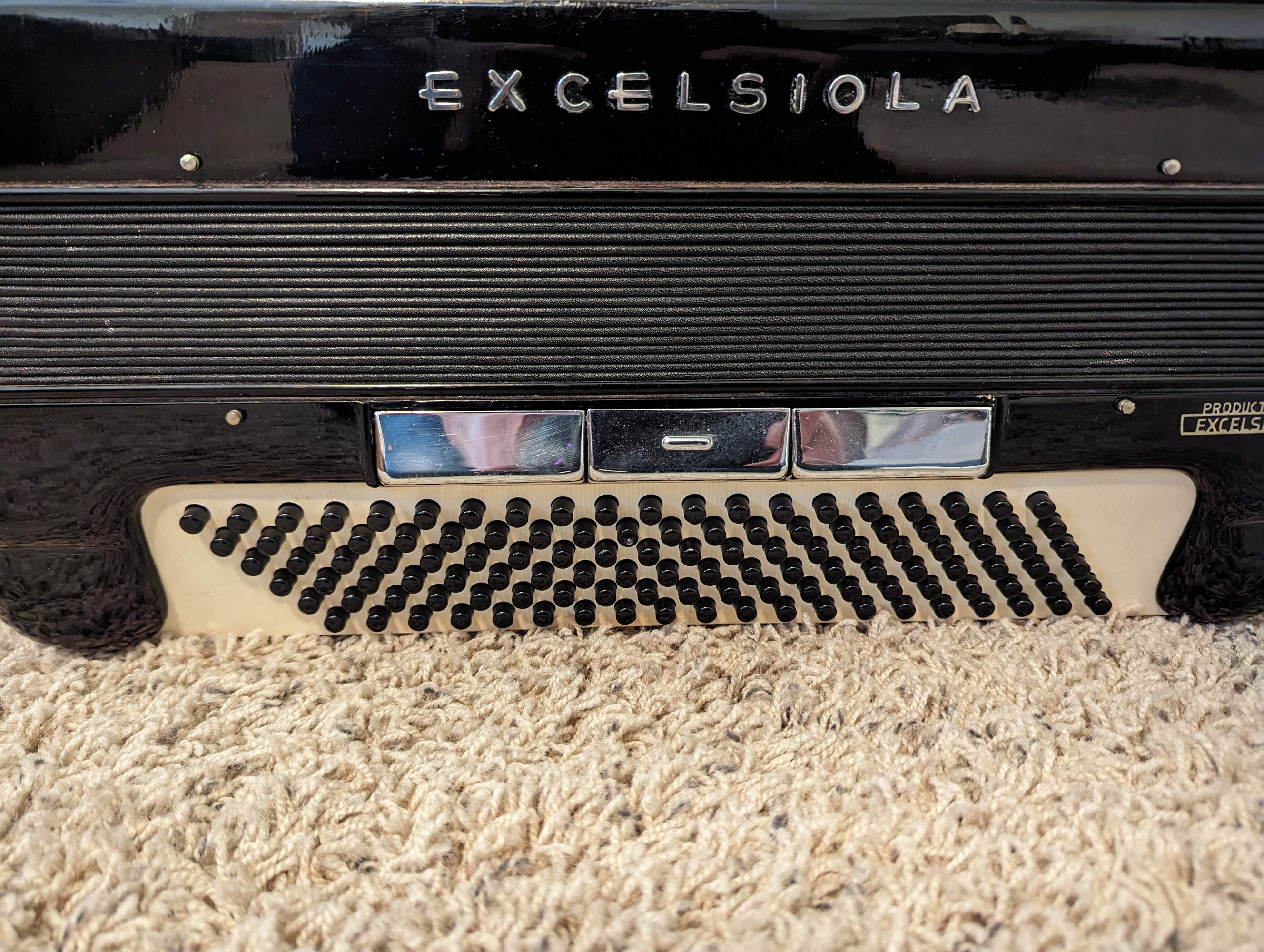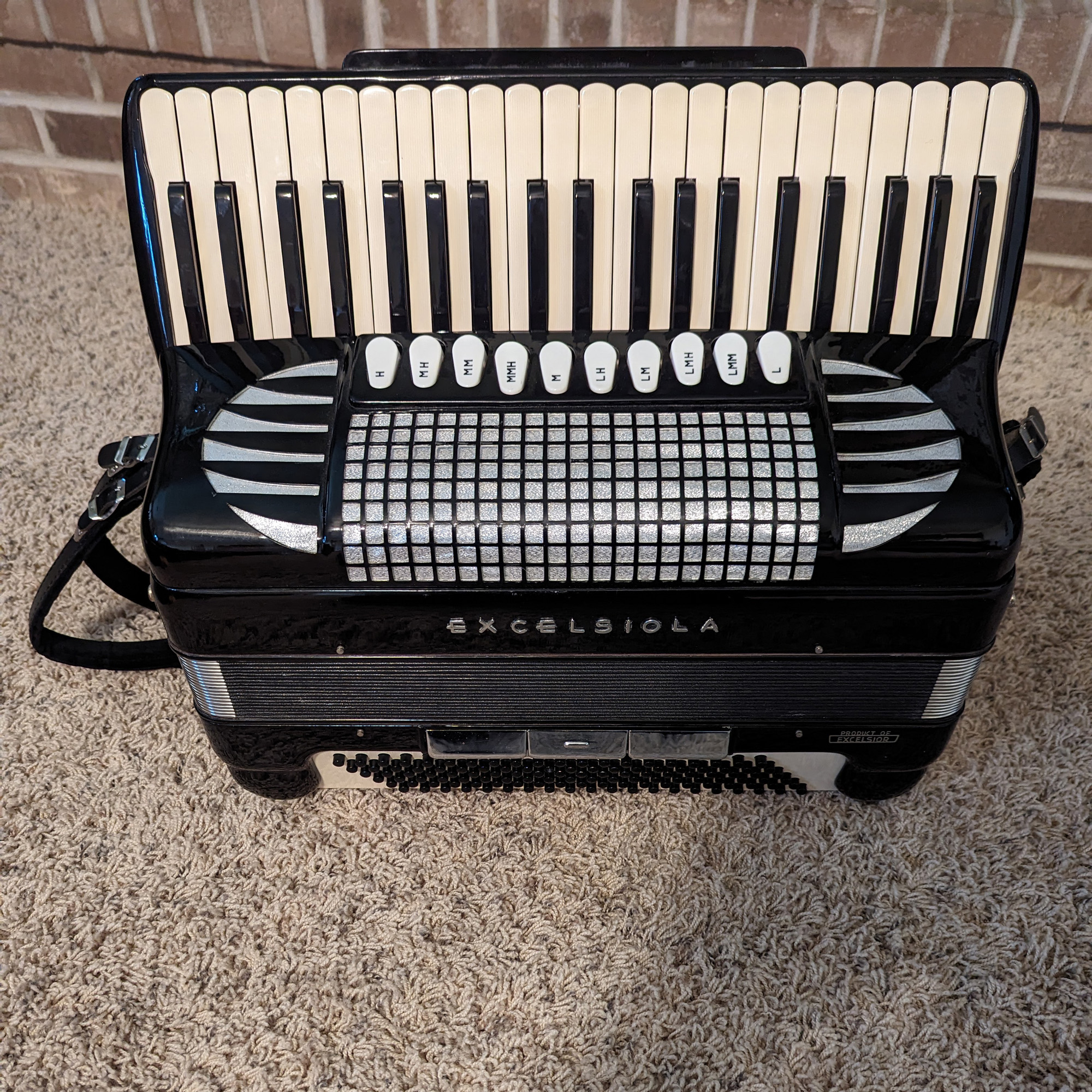 This Excelsiola piano accordion is made by Excelsior. Reed configuration is LMMH.