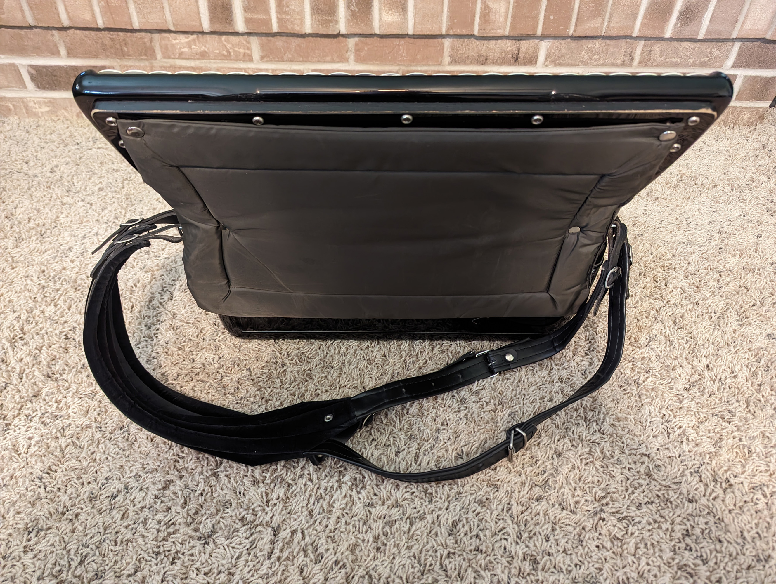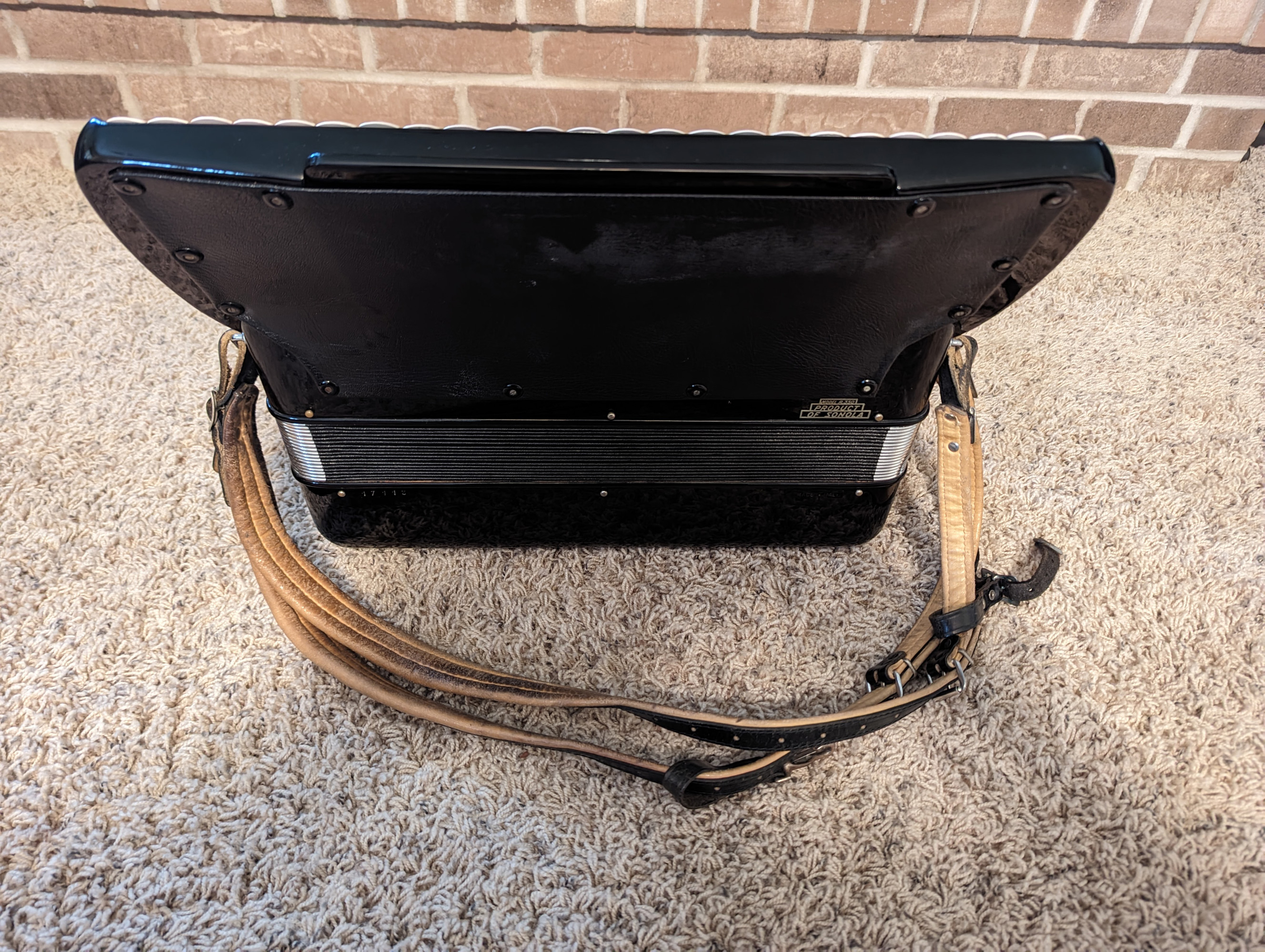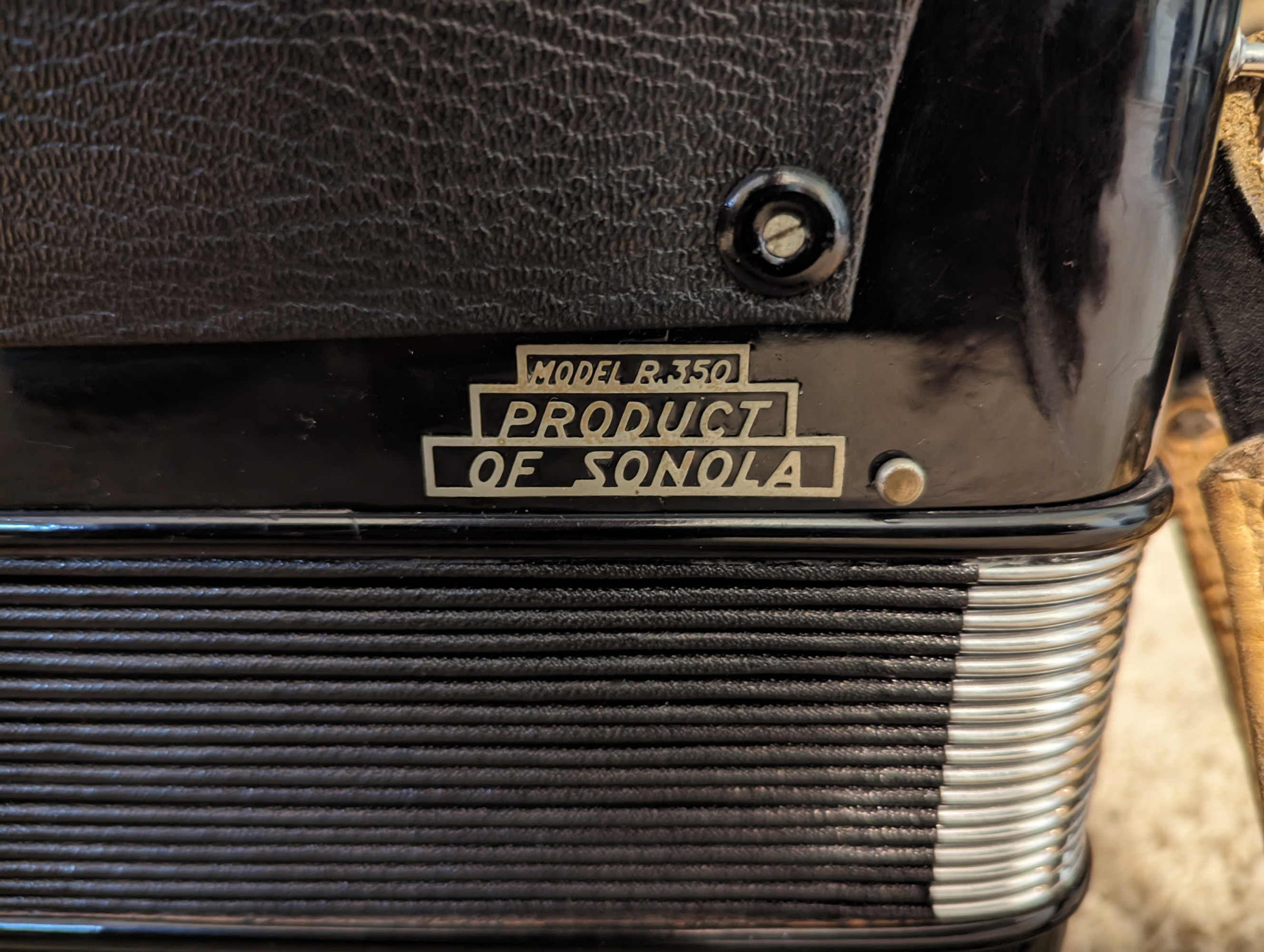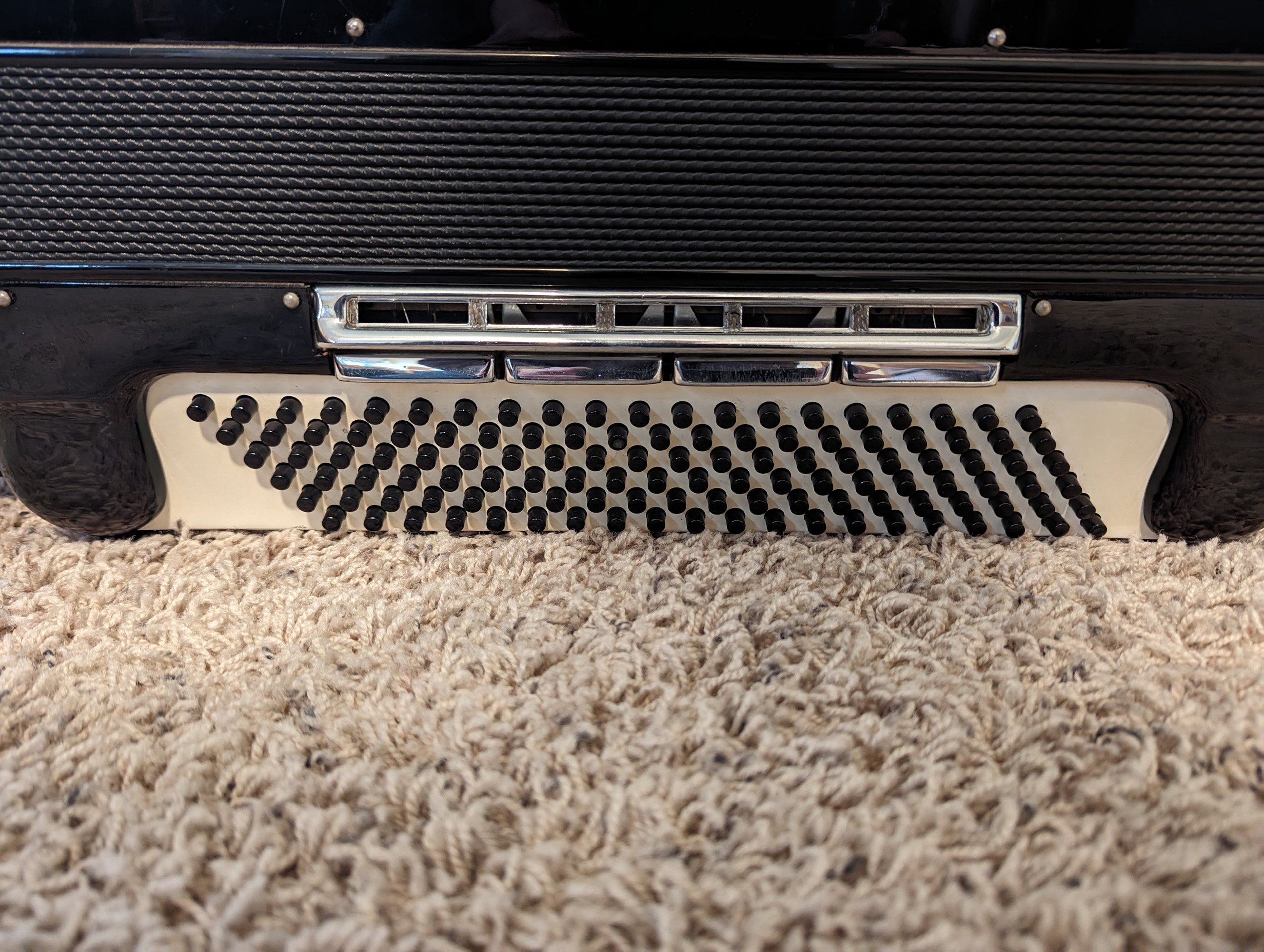 This Excelsiola piano accordion is made by Excelsior. Reed configuration is LMMH.