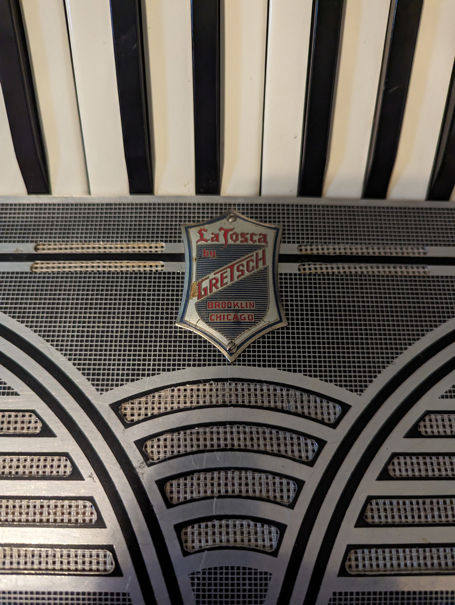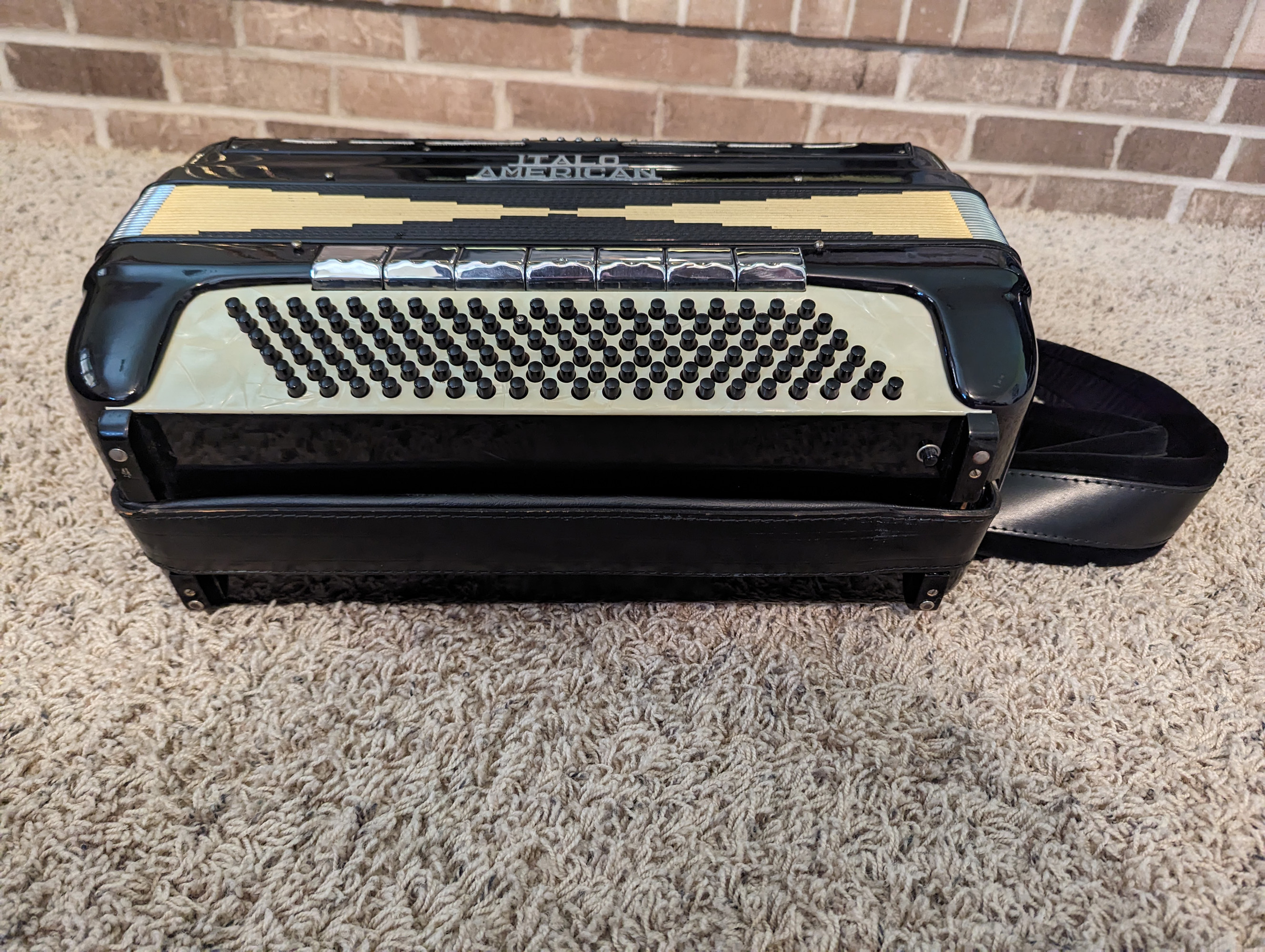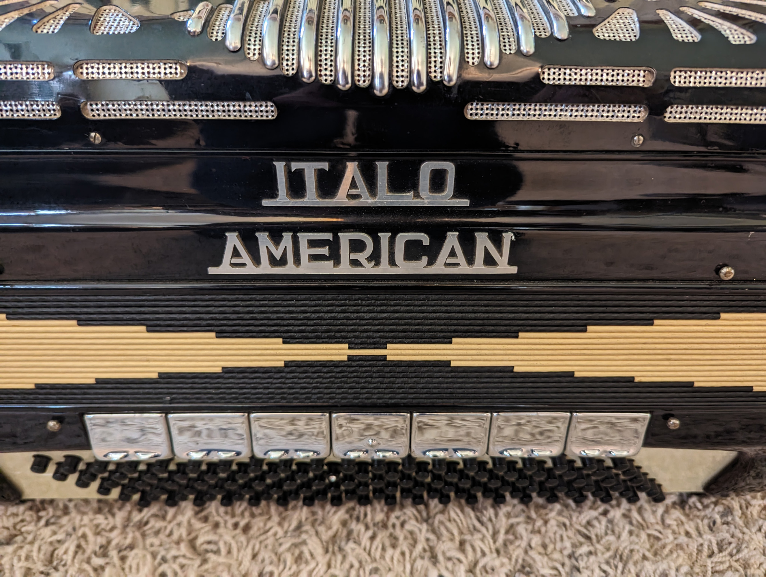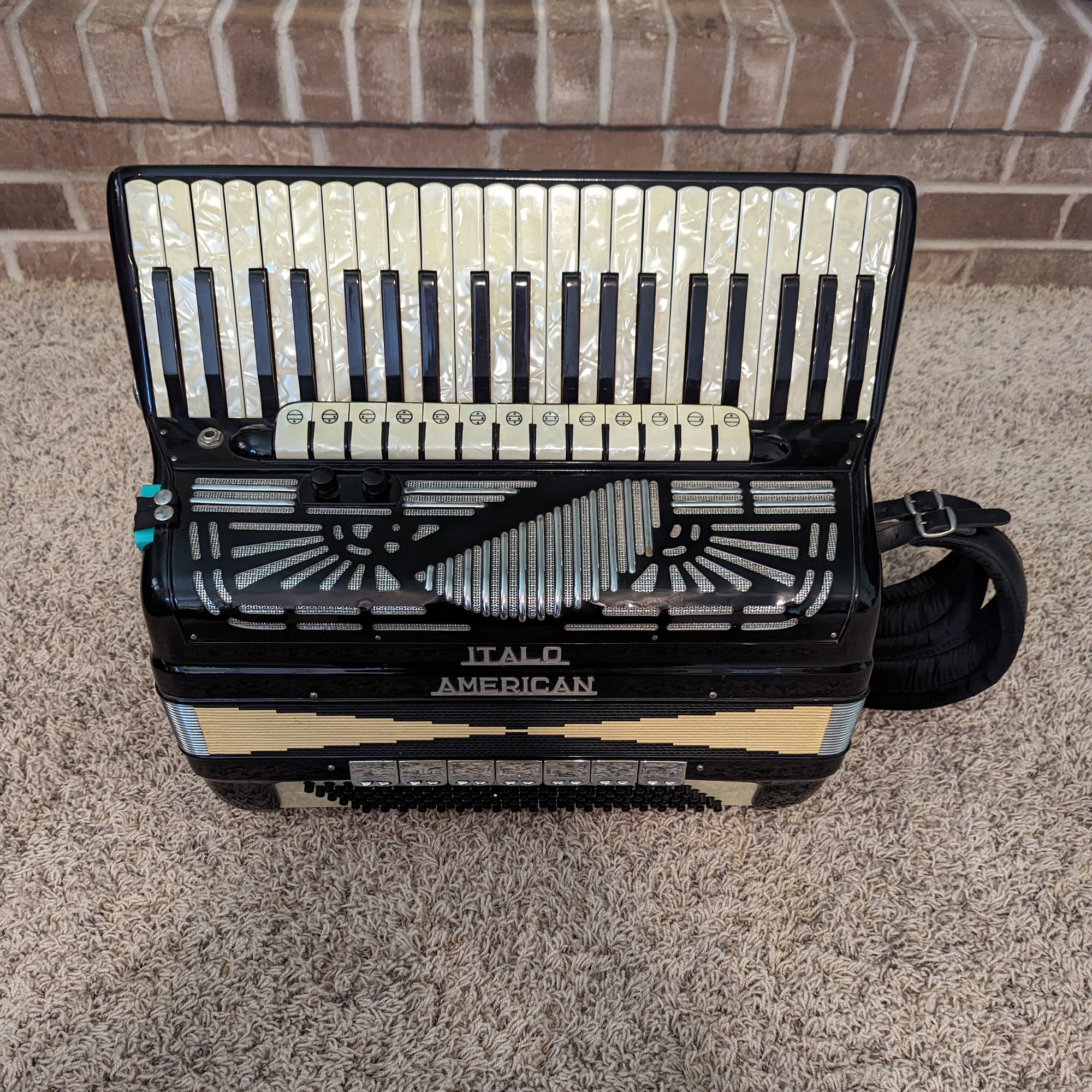 This Italo-American piano accordion features a double tone chamber. The reed